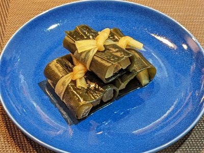 昆布にぶり・大根を置いて巻き、かんぴょうで結びます。鍋に結び目を下にして並べたら、昆布の漬け汁(600ml)・りんご酢(大さじ1/2)を注ぎます。足りない場合は水を足し、落とし蓋をして強火にかけて、煮立ったら中火で5分ほど火を通します。次に、ライチ酒(50ml)・水あめ(大さじ3)・しょうゆ(大さじ1)を加えて10分煮た後、最後にしょうゆ(大さじ1)・みりん(大さじ1)を加えて5分煮含めます。そのまま冷やして、器に盛りつけたら出来上がりです。