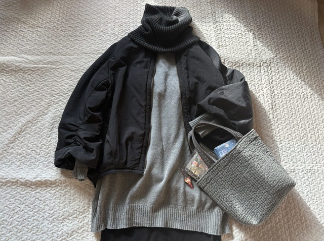 寒い時期に学童→保育園へとお迎えをハシゴするだけでもいっぱいいっぱいだというのに、空前のシールブーム到来につき、必須の持ち物にシール帳が仲間入り。校門の外で子どもがシール交換する間、寒さに耐え忍ぶという地獄のルーティンが課されている私の定番コーデがこちらです。ネックウォーマーはチャコールグレー一択なのですが、手持ち服が黒とグレーメインの私にとってはどんなコーデにもなじむ色みも気に入っています。
