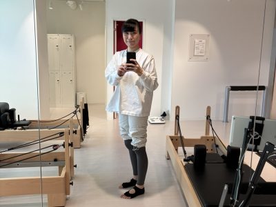 「着圧レギンス」は特にピラティスの時に愛用しています。上から短パンかショートパンツを履いてこのままリフォーマーに乗ります。家から履いていってしまいますが、オーガニックコットンがメインの混紡繊維なので伸縮面も通気性面も完璧。着圧機能で骨盤部分をサポートしてくれるため背筋が延ばしやすく、より気持ちよくポーズが取れています。ヒップシェイプアップ設計で、下半身が引き締まったシルエットになるところも嬉しいポイントです。