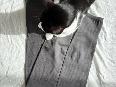 今回、ご紹介しようと写真を撮っていたら、いつの間にかネコが着圧レギンスの上に座っていました。暖かくて気持ちのいいものに目のないネコからもお墨つきです!