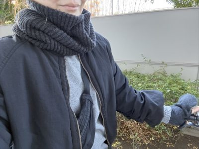 まずは、さっとかぶるだけで様になり時短おしゃれも叶うニット素材のネックウォーマー。表側は絶妙にくしゅっとおしゃれに見えるリブ編み、裏側は肌あたりがやわらかいフラットな編み地で、機能面だけでなくデザインも◎なのがおすすめしたいポイントです。寒いと体が縮こまるため、ただでさえ万年肩コリの私は、冬は大判ストールが欠かせなかったのですが、ボリュームで視界が遮られたり、結び目がほどけたりして自転車には不向きだなと感じていました。このネックウォーマ―に出会ってからはストレスフリーに!