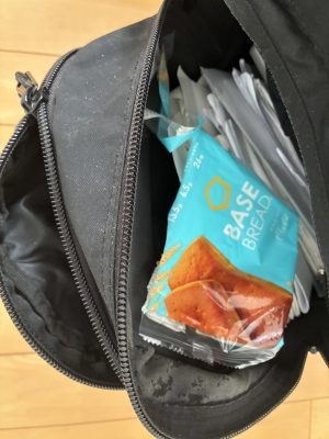 リュックから発掘された空き袋は、タンパク質を多く含む完全栄養パン「BASE BREAD」のミルク味のスティックパン。睡眠を意識するのは素晴らしいので、次はゴミをゴミ箱に捨てられるようになってほしい!