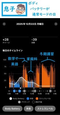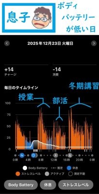 (クリックして拡大)学校に行ってから、17:30~20:00で塾の冬期講習初日。この日の結果を見ると、前日チャージされたエネルギー量は28。前日は予定なしでリラックスして過ごせたわりには、あまり休息ができていなかった模様。でもこの日は、数学や英語などハードな内容の授業が続く午前中早めはストレス値高め、つづく家庭科の授業のころはリラックスモード。そして冬期講習が始まるころには、すでにボディバッテリーの残量が最低ラインに!