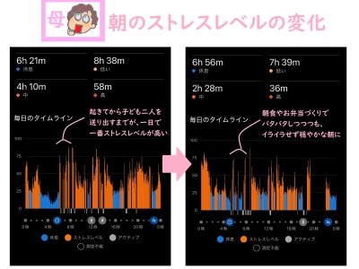 (クリックして拡大)左が何度も起こしにいっていた頃の母のストレスレベル。子どもたちが登校するまでずっと「高」のオレンジのまま。右が息子がウォッチのアラームで起きるようになってきたころのもの。イライラしつつも、「休息」のブルーの量も多く、比較的おだやかな朝に