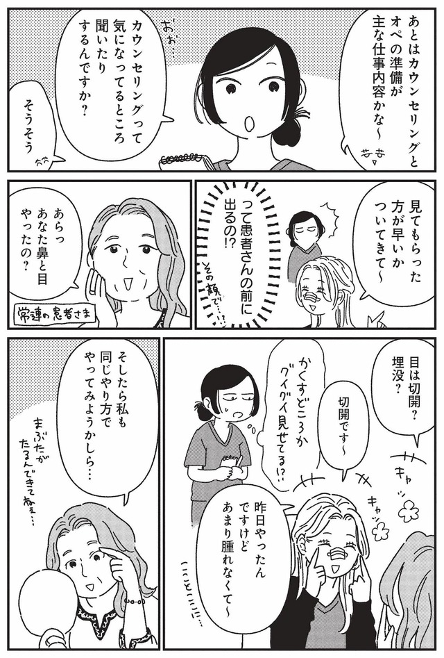 「社割で美容代がお得になる」という甘い言葉に惹かれて働き始めたものの、待っていたのは顔面ギプス姿の先輩や、アニメキャラの顔を目指す患者、社長が連れてくる大量のキャバ嬢たち……。