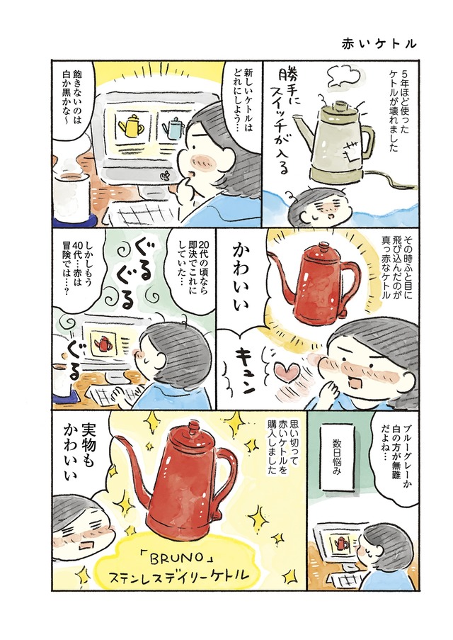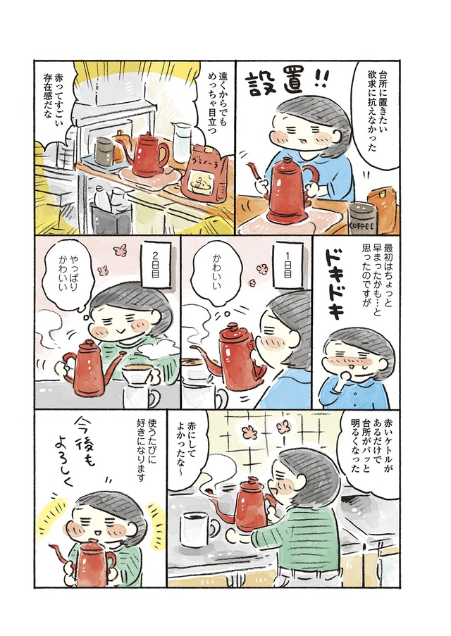 赤いケトルを買ったり、黒縁のメガネやキャップでおしゃれを楽しんでみたり、「すぐ忘れるスイッチ」を入れて嫌なことを忘れたり、目標設定をゆるめにしたり…。