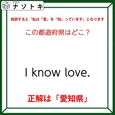 まずはこの英文を日本語に訳してみましょう。すると「私は愛を知っています」となりますね。「私」はともかくとしてそれ以外の漢字の部分だけを抜き出してみましょう。すると「愛」と「知」ですね。ここまで来ればわかりますね。繋げると「愛知」となります。というわけで正解は「愛知県」でした。