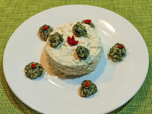 次に『立春大吉豆腐』。先ほどのあずきは“赤い豆”でしたが、こちらの豆腐は“白い豆”の大豆由来ですね。「白い豆腐は邪気を追い祓う」と考えられていたことに由来する風習で、豆腐は身体を清めて幸せを呼び込むそうです。「白い豆腐はそのまま食べた方が良い」と、しょうゆではなく塩で食べた方が良いとも言われるようですが、作り立ての豆腐は、豆乳(大豆)のほのかな自然の甘みが感じられます。この「ほのかな自然の甘み」は、先ほどの『朝生菓子』の米・もち米などの穀物と同様に脾の機能を助ける働きをします。