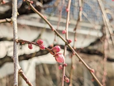 再春館ヒルトップには、園内に入ってすぐのところに根を張る“白梅”と、化粧品・医薬品を製造する工場(薬彩工園:やくさいこうえん)の入り口で育つ“紅梅”のしだれ梅がいます。しだれ梅のつぼみがそろそろちょっとだけ膨らみ始めています。遅くとも2月末には満開になりますが、2月のどこでほころび始めるかは毎年違います。今年はいつあのしだれ梅の鮮やかで見事な咲き誇りっぷりを目に出来るのか、今からもう楽しみです。