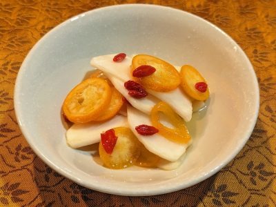 これらの“腎・肝・脾の機能にうれしい食材”を使ったおススメレシピの1つ目は「金柑・かぶ・クコの三色なます」です。スーパーの果物コーナーに行くと柑橘類がたくさん並んでいますが、特に目に飛び込んでくるのが“旬の金柑”。金柑の甘露煮以外の食べ方をレシピにしてみました。