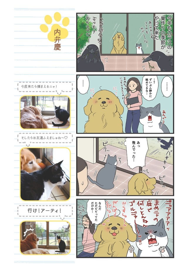 「ですし!」が口癖のゴールデンレトリーバー・アーティと、いつもイライラ怒ってばかりなのに家族思いなハチワレ猫・まめ。