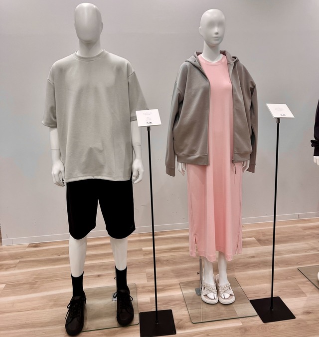 写真左 オーバーサイズTシャツ、ハーフパンツ。写真右 ジップパーカー、コンフォートロングシャツ。すべて4月発売予定、価格未定