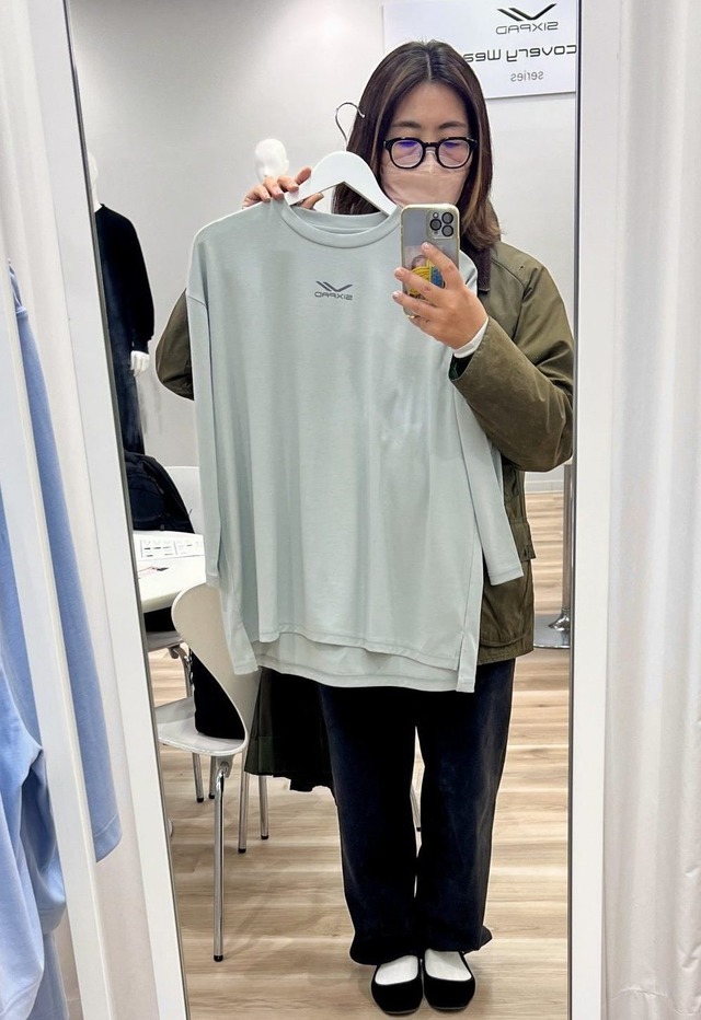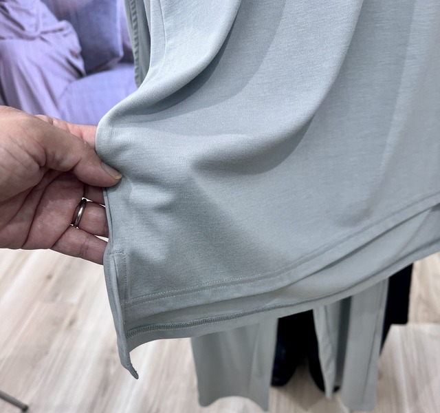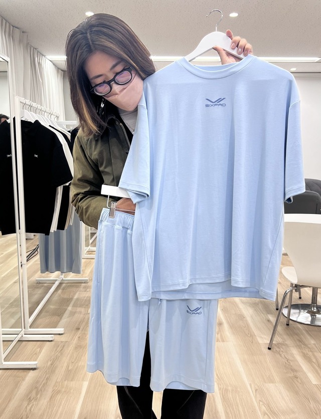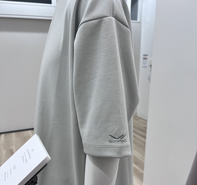 生地は肉厚でしっかり、ボックスシルエットなので、ボディラインを拾わず。お尻は程よく隠れる長め丈。ありがたい。さらにSIXPADの信田さんに商品についてのこだわりポイントなどをお聞きすると