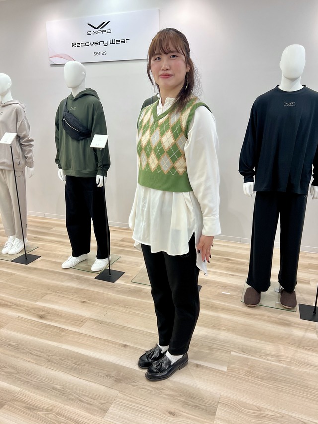 広報の松澤さんは展示会中、ボトムを着用。「1日中の立ち仕事も乗り切れました」