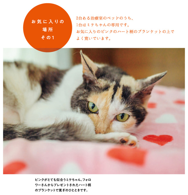 治療室に見えるご常連さんも、最初こそ片足のないミケちゃんの姿に同情しますが、何度も接していくうちにそんなことは全く気にならなくなるようです。