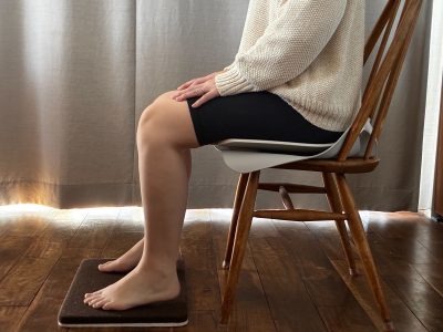 本体に座る際、中央の電極部分と会陰部を密着させる必要があるのですが、床に足がつかないと姿勢がふらつき、正しい場所に電気刺激が加わらない原因になります。普段は床に足が付く高さの椅子も、本体を乗せるとその厚み分座面が上がるので、足が不安定に……。