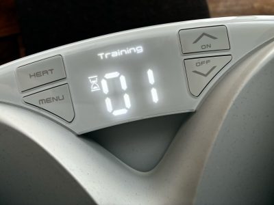 電気刺激の強さについては、「ビリビリ感が強くて痛いかも」と若干ビクビク……。ところが、体の前面にある操作パネルで様子を見ながら刺激の強さをコントロールできるあたり、さすがです!筋肉への心地よい刺激を感じつつも、痛みはないレベルを、安心して探ることができました。