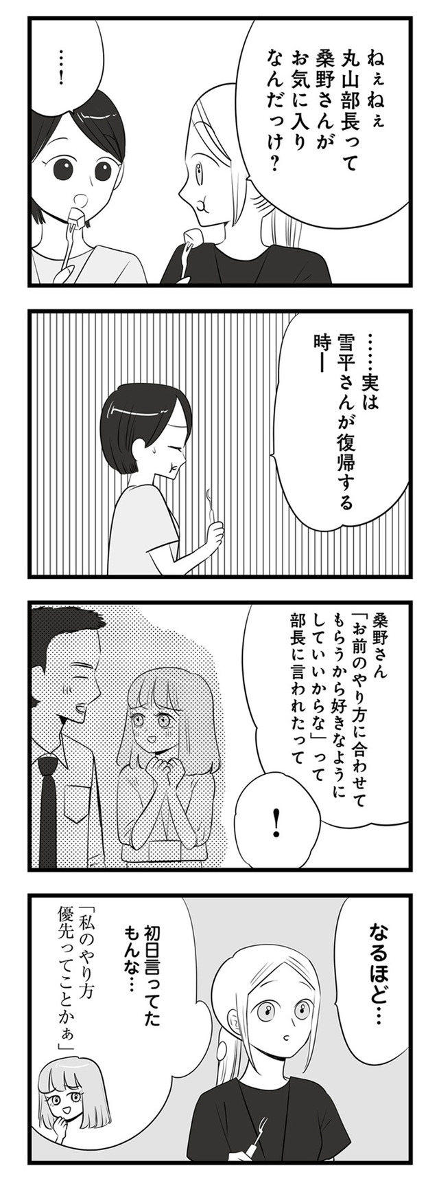 産休から戻った雪平の自然体な仕事ぶりと対人スキルにやきもきし、桑野は密かに雪平をライバル視する。