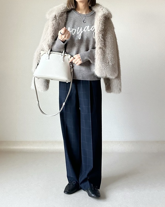 ボトムスにはネイビーのチェック柄ワイドパンツを合わせ、知的な印象をプラス。全体を寒色系でまとめることで、ロゴアイテムを取り入れても子供っぽくならず、洗練された雰囲気に仕上がります。バッグには明るいベージュをセレクトして、コーディネートに軽やかさを出すのがポイントです。足元は黒のフラットシューズできゅっと引き締めれば、上品なデイリースタイルの完成です。