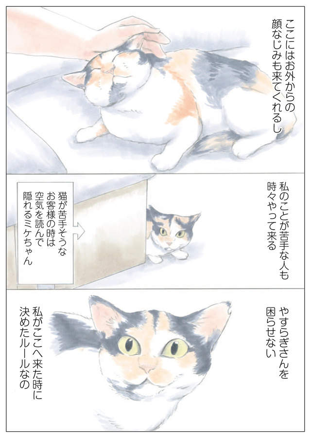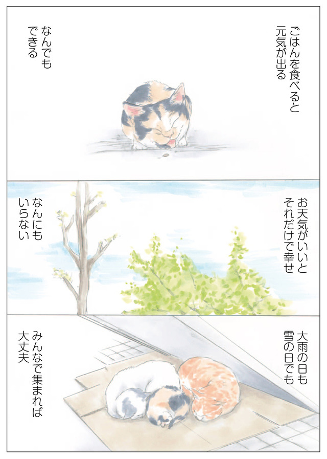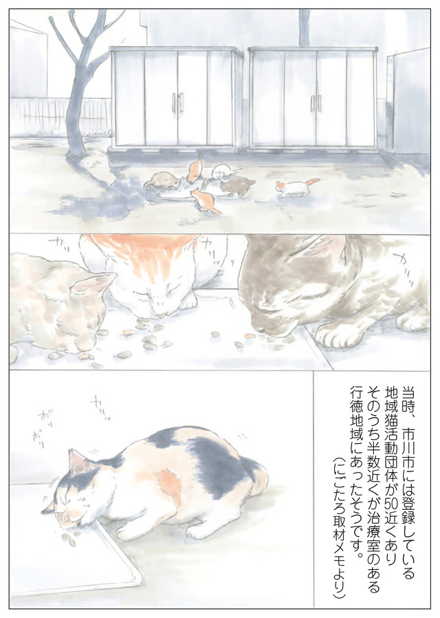 店先でミケちゃんにごはんをあげると、ミケちゃんは必ず半分近くを残して裏にいるシロちゃん達を呼びに行っていました。ごはんをひとり占めにせず皆と分け合おうとするミケちゃん…。
