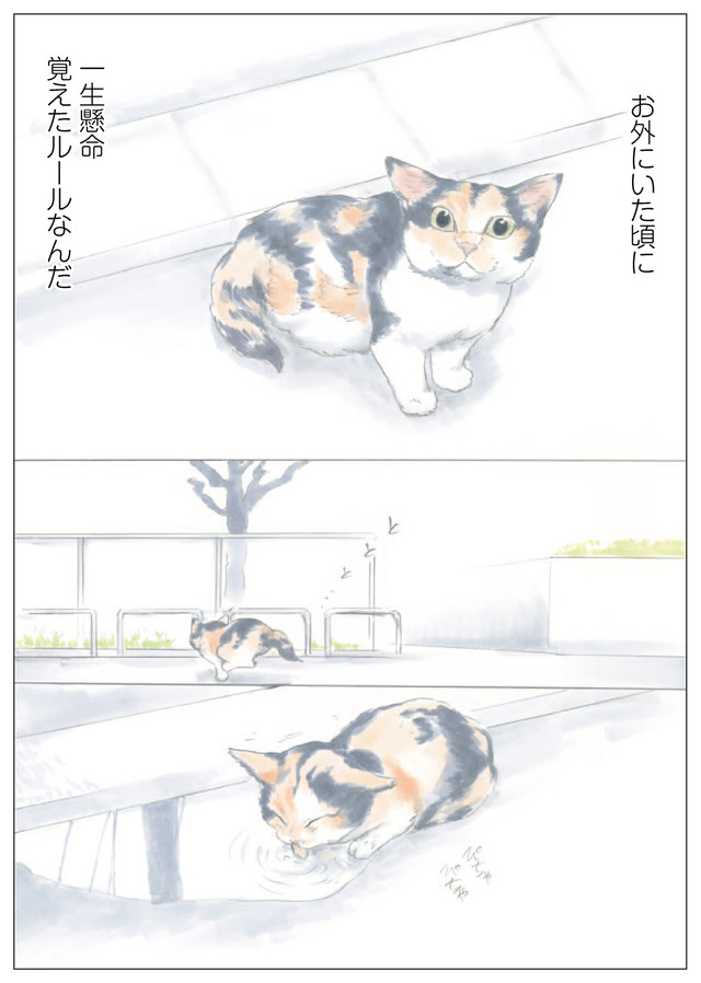 それからしばらくして、首輪をつけたきつねこちゃんがミケちゃんを訪ねて来ました。「ミケちゃん、私ご近所のおうちの子になったの。今日は挨拶に来たのよ」もう一緒には遊べない…。ちょっぴり切ないお別れではありましたが、危険で過酷なお外の生活にさよならできたことを思えばよかったのかもしれません。