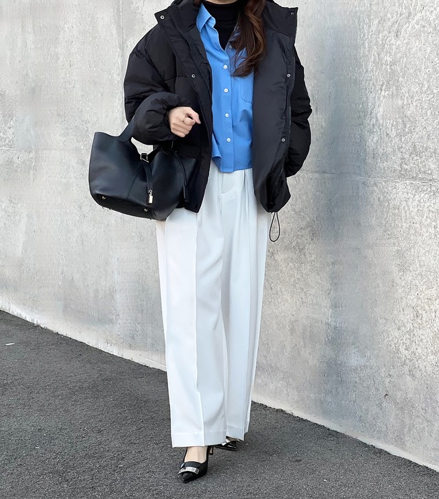 ボトムスにはクリーンな白のワイドパンツを選び、重くなりがちな冬の装いをパッと明るく仕上げています。足元はポインテッドトゥのパンプスでキリッとまとめ、カジュアルなアウターを品よく格上げ。動きやすさと防寒性を兼ね備えた、大人の日常に寄り添うスタイリングです。