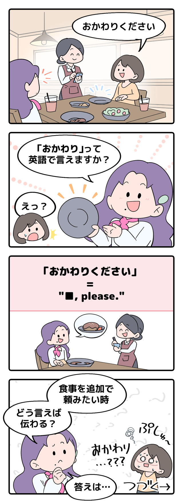 「英語嫌いな日本人をなくしたい!」海外生活や添乗員経験、そしてバイリンガル子育て中の英会話講師・Mrs.服部が、身近な英語表現を漫画&クイズ形式でお届け! 「間違ったら恥ずかしい」じゃなく「伝わればOK」。使えるフレーズをマンガで学びましょう!