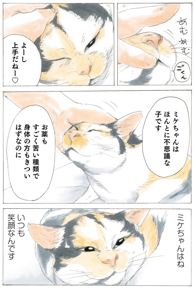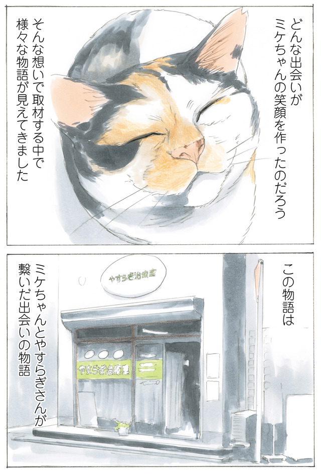 生まれつき後ろ足が一本ない野良猫のミケちゃんは、嵐の夜をきっかけに院長のやすらぎさんの店猫として暮らすようになりました。