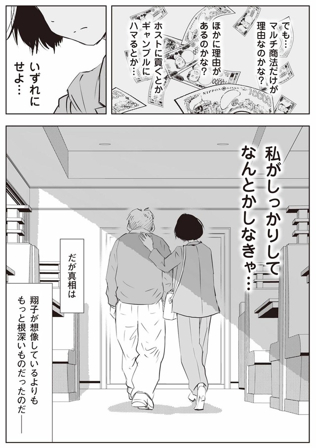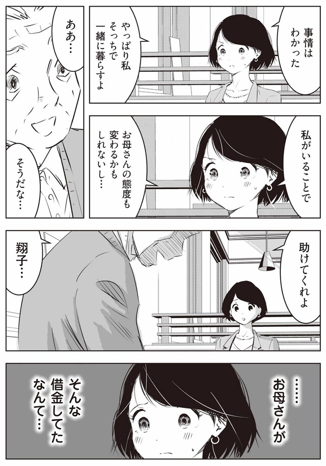 6年勤めた仕事を辞め、実家に戻った翔子は、母が父の退職金を口座から引き出し、使い込んでいると知らされる。