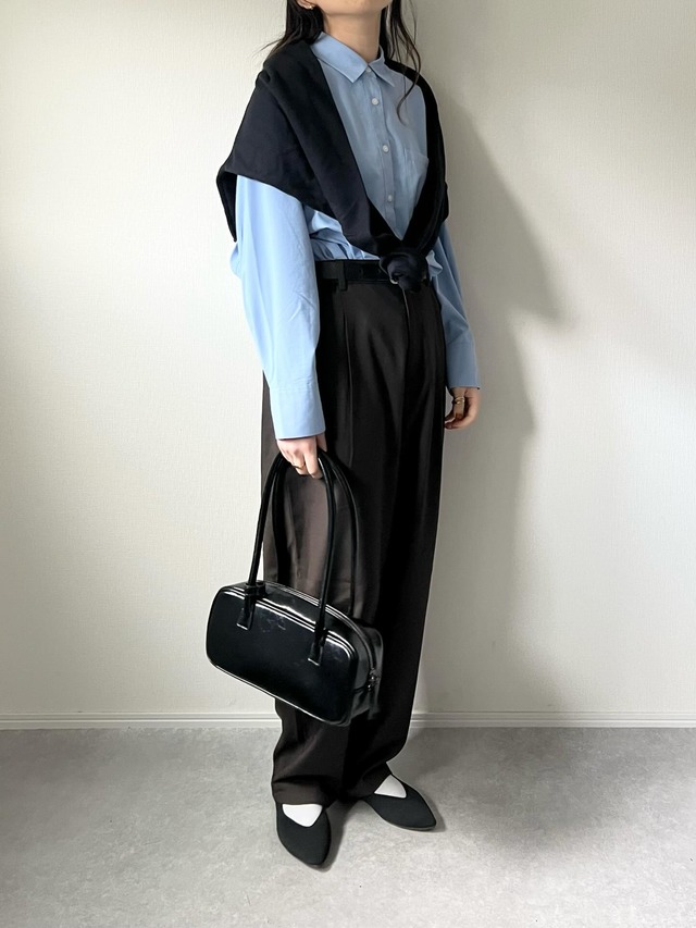 トップスはGU「ドルマンスリーブシャツ」2,490円(サイズL着用)を合わせて、ストレスフリーな着心地を重視。肩掛けしたニットでより今年顔に。自分をきれいに見せてくれる一着を知っていれば、毎日の着こなしはもっと楽しく、うれしいものになりそうですね。