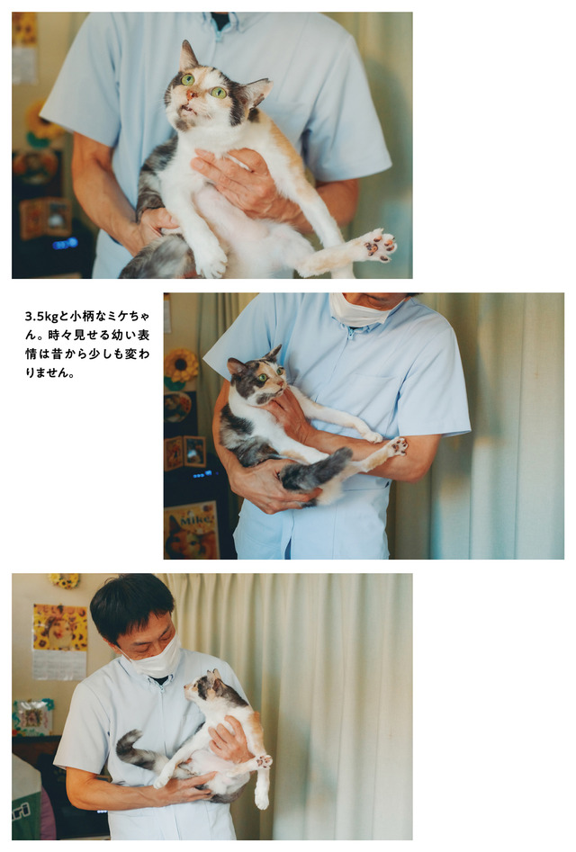 生まれつき後ろ足が一本ない野良猫のミケちゃんは、嵐の夜をきっかけに院長のやすらぎさんの店猫として暮らすようになりました。