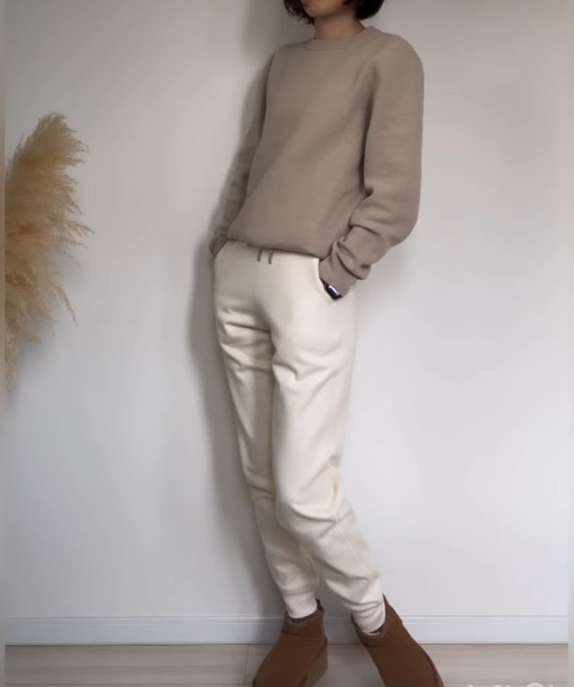 「冬の公園や習い事の待ち時間も、おしゃれに暖かく過ごしたい」という願いを叶える、cococloset128さんの着こなしです。メインアイテムはユニクロの「ヒートテックボアスウェットパンツ」(162cmでサイズS着用)。細身のシルエットがスウェット特有の野暮ったさを払拭してくれます。オフホワイトを選べば、スポーティーなアイテムもクリーンで洗練された印象にまとまるのがポイントです。