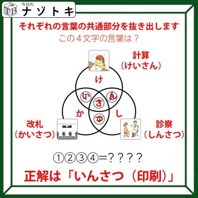 ベン図で重なっているところは共通の文字が入ります。つまりそれぞれを言葉にしたときの共通文字が重なっているところに入ります。ちなみに左のイラストは「かいさつ(改札)」です。