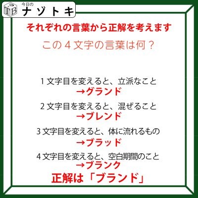 正解となる言葉があり、文字を一文字変化させることによって別の言葉を4つ作っています。ヒントをもとに言葉を考えてみると、上から「グランド」「ブレンド」「ブラッド」「ブランク」になります。一つでも分かればそこからそれ以外の答えも出てくるかと思います。あとは4つの言葉から正解の言葉を考えましょう。正解は「ブランド」でした。