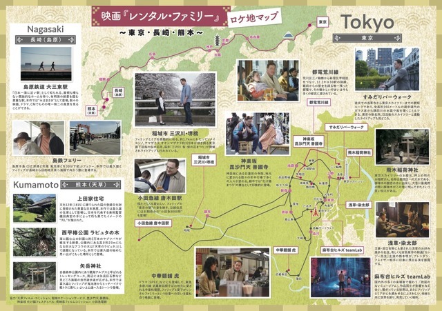 今回完成した特別ロケーションマップでは、数々のロケ地情報を集約。文豪・坂口安吾にも愛された浅草にあるお好み焼きの名店・染太郎や、地元民に愛される武蔵新田駅近くのの中華麺舗 虎、本作の撮影タイミング直前にオープンした麻布台ヒルズのteamLabなど、多くの名所が紹介され、東京や長崎、熊本といった日本各地を温かな絆で繋ぎあわせている。主人公のフィリップを演じたブレンダン・フレイザーも日本での撮影を大いに堪能したようで、「『レンタル・ファミリー』は僕にとって特別な作品です。この映画は日本へのラブレターであり、僕の溢れる思いを桜色のインクで綴り、キスで封印しておきました」と最大級の愛溢れるメッセージが添えられている。