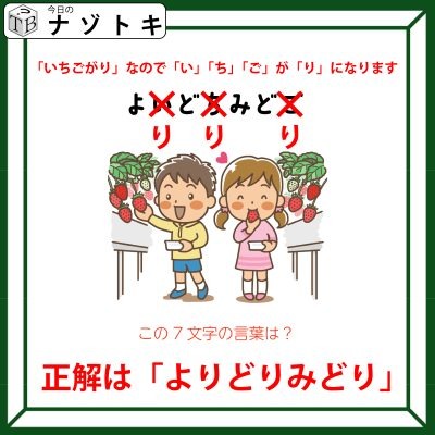 「いちご狩り」が示す謎解きは、「い」「ち」「ご」が「り」になるということです。その上で、先ほどの言葉を変換してみましょう。そうすると「よりどりみどり」となります。正解は「よりどりみどり」でした。