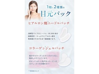 1箱に2種類の目元パックが入っているセット。「ヒアルロン酸ニードルパッチ」6回分に加え、「コラーゲンジェルパッチ」6回分入りで、コスパ抜群!