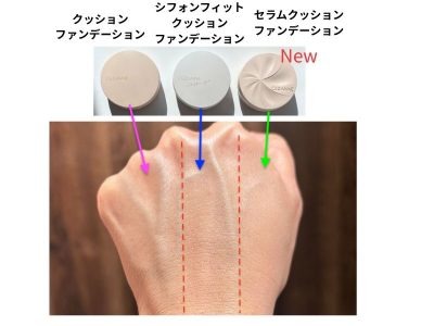 次にツヤ感について腕に塗って比べてみたところ、廃盤した初代「セザンヌ クッションファンデーション」に軍配が上がりました。みずみずしく光を跳ね返すようなツヤ感が非常に印象的です。しかしながら、角度を変えながら肌を観察すると、新作のほうがあらゆる角度から見て安定したツヤを放ち、肌がなめらかに整って美しく見えると感じました。