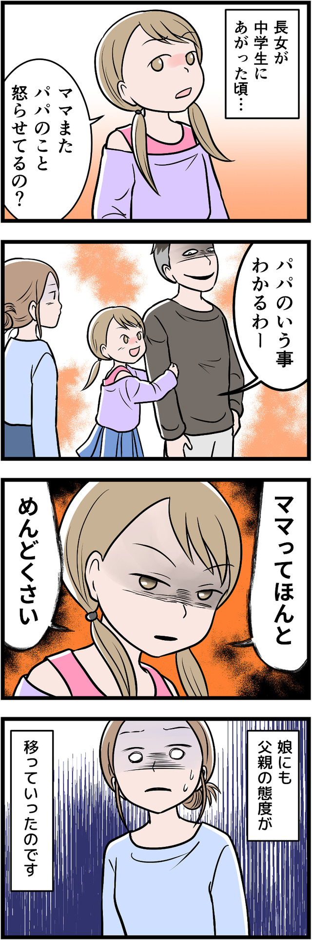 長女は父親に気に入られようとする様子を見せるように……。そうした中で、母親を見下す態度が加速していきました。「パパのほうが正しい」と笑う長女は、冷たい視線でEさんを見るようになっていったのです。そして…▶▶モラ夫が王様で、長女が側近。私と次女は、奴隷以下の扱いで…。そんな中、起こったことは