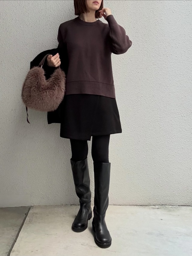 ミニ丈に抵抗がある方でも、厚手のタイツとボリュームのあるブーツを合わせれば、露出が抑えられ挑戦しやすくなります。仕上げに毛足の長いファーバッグを添えて、季節感たっぷりのアクセントをプラス。全体をダークトーンでまとめることで、品よく落ち着いた印象に仕上がります。