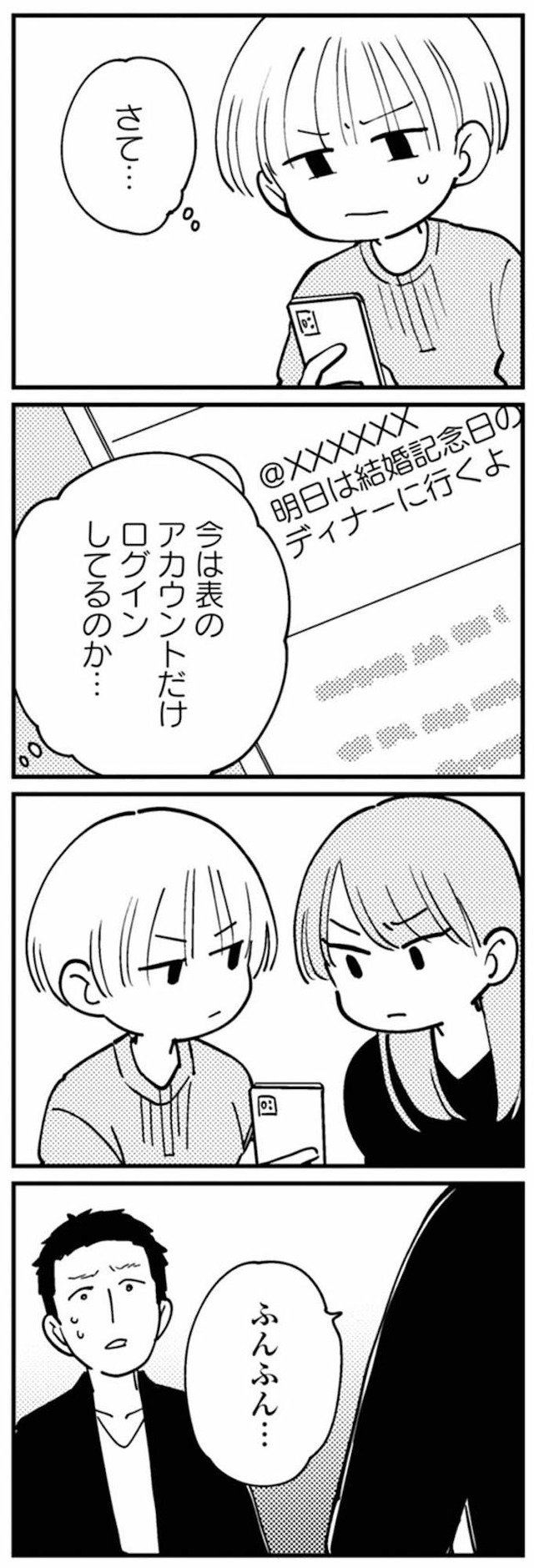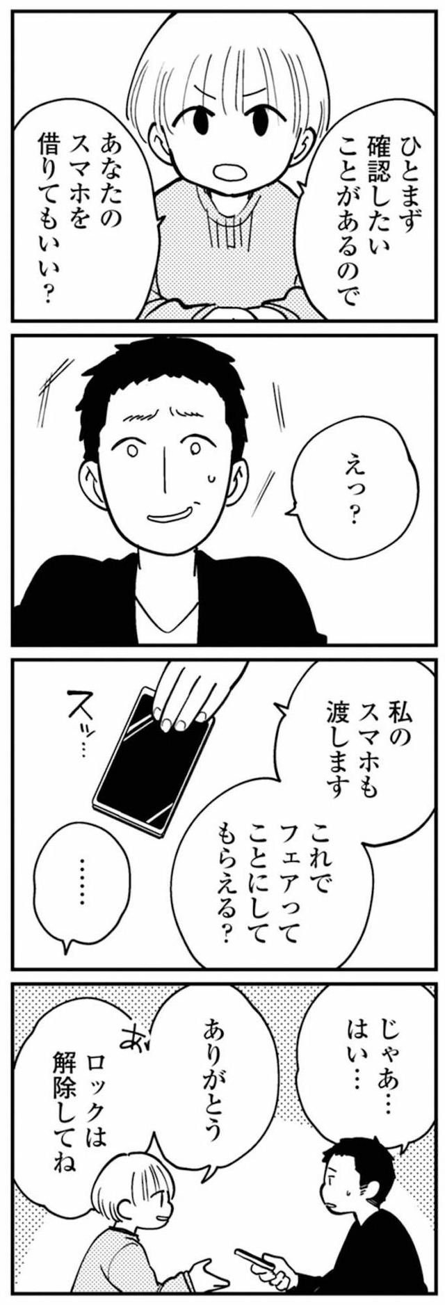 ただならぬ雰囲気に動揺する夫。席に着いた妻の第一声は、迷いのない「スマホ見せて」【夫が裏アカで70人と不倫してました #11】