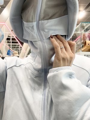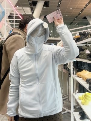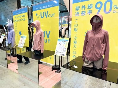 バリエーション豊富な紫外線対策コーナーで1番注目を集めていたのが、クールUVサンシェードパーカーEX です。ファスナーを上まで閉めると顔を完全に隠せるデザインが通称「不審者パーカー」としてSNSを中心に拡散し、2025年夏には2万6000点が完売。2026年は製造数を大幅に増やし、12万点の販売を計画しているそうです。