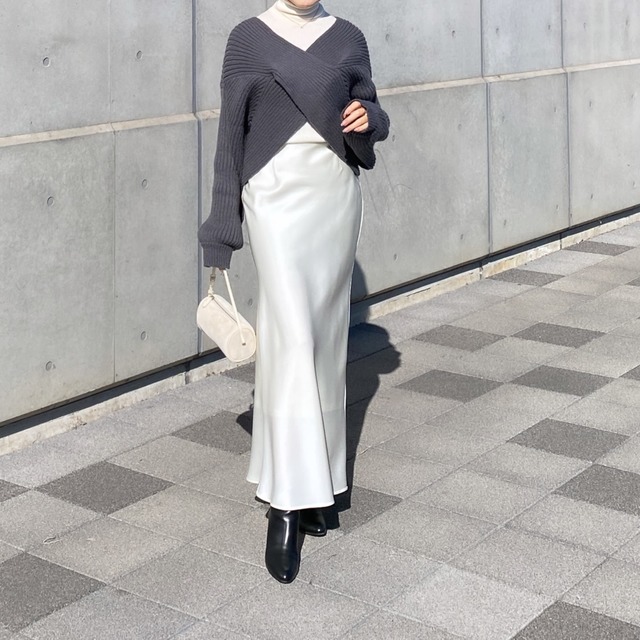 ボトムには光沢感が美しいホワイトのサテンスカートを合わせることで、異素材同士の白が重なり、奥行きのあるグラデーションが完成します。マーメイドラインのシルエットが歩くたびに揺れ、重たくなりがちな冬のスタイルに軽やかさをプラス。足元は黒のブーツで全体をきゅっと引き締めれば、甘さを抑えた都会的なバランスに仕上がります。バッグも白で統一して潔くまとめるのがポイント。