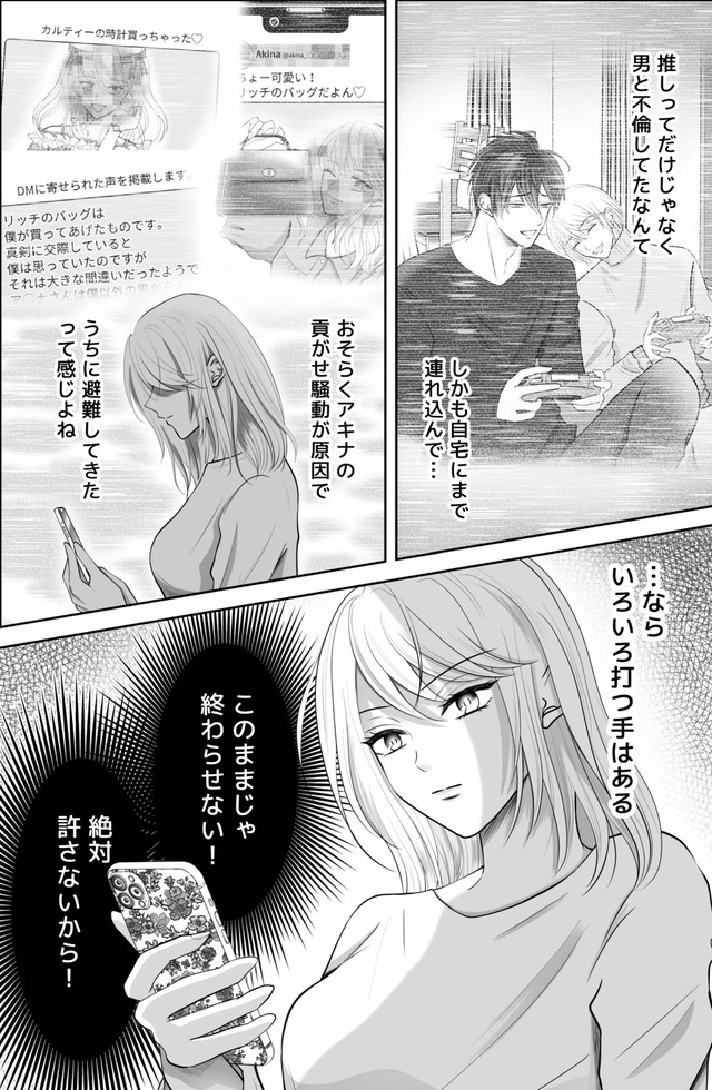 由衣と守は、お互い「推し」を大切にする夫婦。地下アイドル「アキナ」の熱狂的ファンの守は、ある日、彼女の“秘密”を知ってしまう。急に態度が変わった夫に対して違和感を感じた由依。やがて疑惑は確信へと変わり…。本記事はともりん著の『夫の不倫相手は、推しの地下アイドル(男)でした。』から一部抜粋・編集しました。BLの要素を混ぜ合わせた不倫夫への復讐劇をお楽しみください。