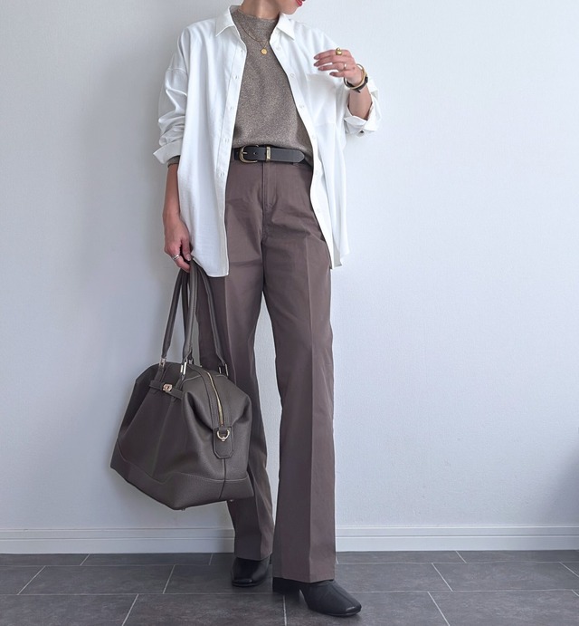 インナーには落ち着いたトーンのニットを合わせ、白シャツをさらりと羽織ることで、顔周りに明るさと抜け感が生まれます。ボトムスにはセンタープレスの効いたブラウンのパンツをセレクトし、ベルトでウエストマークすることできちんと感をプラス。足元は黒のブーツできゅっと引き締めれば、動きやすさと洗練された雰囲気を両立した大人のカジュアルが完成しました。大きめのボストンバッグを合わせた、旅行や出張にもぴったりの機能美あふれるスタイルです。