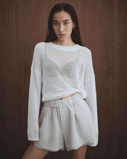 Sheer tie Knit ¥28,600Linen relaxed short Pants ¥36,300