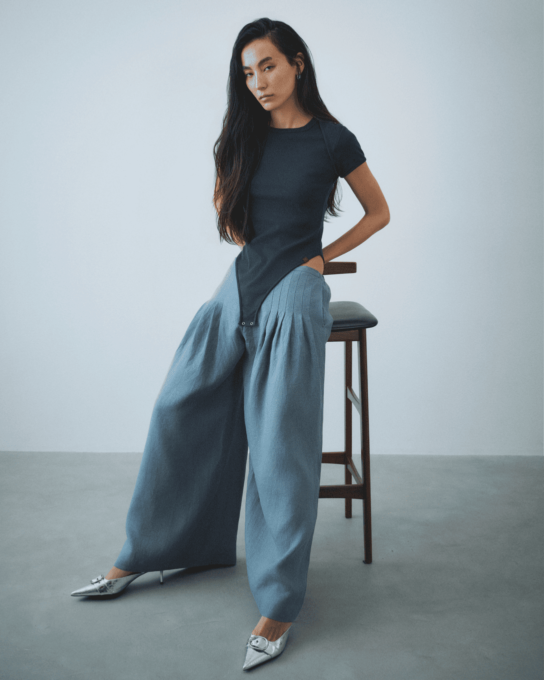 Cotton High-leg Leotard ¥25,300Linen relaxed dress Pants ¥53,900