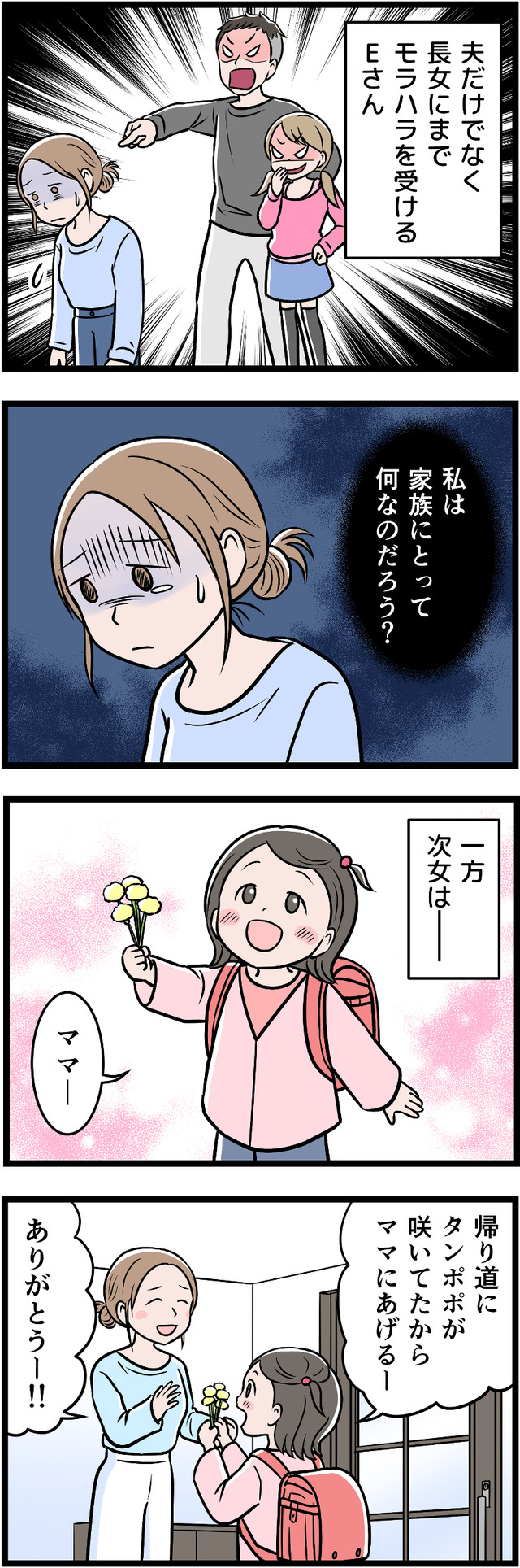 私は家族にとって何なのだろうか……と心が折れそうになる日々に光となってくれたのは、次女の存在でした。しかし、モラハラの波は容赦なくEさんと次女を飲み込んでゆくのです。