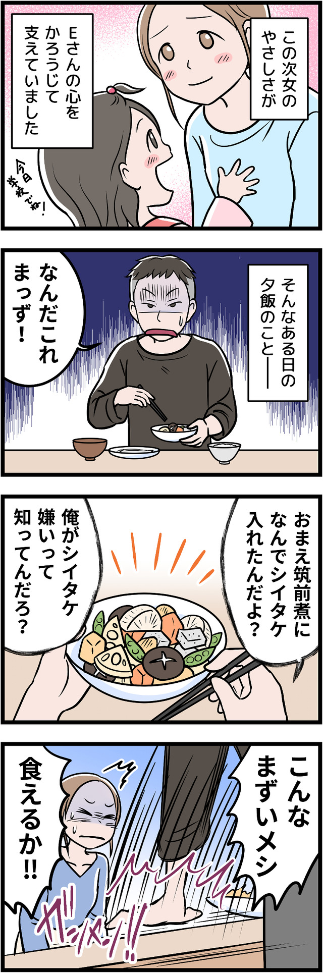 夫と長女からあざ笑われ、傷つけられる日々。しかし次女は、素直な優しさでEさんの心の支えとなっていました。しかし、ある夜、「飯がまずい」と机をたたきつけた夫……▶▶「ホント、ママってさ…」長女の一言で、私は虚無になった。しかし次女の一言に、涙が出そうになって