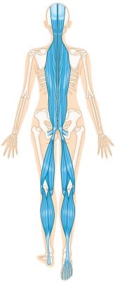 「浅層(せんそう)バックライン」のスタート地点は、おでこの前頭筋。頭頂部から、首まわりの後頭下筋群、背中の脊柱起立筋、裏もものハムストリングス、ふくらはぎの腓腹(ひふく)筋、アキレス腱、そして足裏の足底筋へとつながっています。